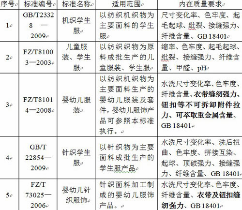 我國現(xiàn)行紡織品標(biāo)準(zhǔn)體系中,適用童裝產(chǎn)品的標(biāo)準(zhǔn)有5個,分為梭織和針織兩大類。