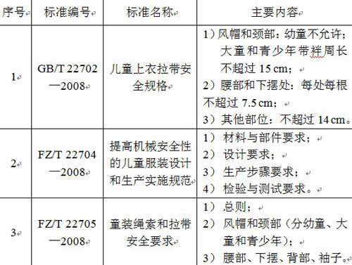該系列標(biāo)準(zhǔn)專注于童裝小零部件安全性能,以避免兒童危險事故為主要原則和依據(jù),規(guī)定了兒童上衣拉帶的安全規(guī)格、童裝使用繩索和拉帶的安全要求、童裝材料、設(shè)計(jì)、生產(chǎn)的實(shí)施規(guī)范,已于2009年8月1日起正式實(shí)施。詳細(xì)內(nèi)容見表2。