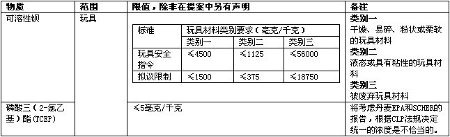 2012年8月28日,歐盟授權(quán)立法委員會(European Comitology Register)公布兩份工作文件,擬議根據(jù)玩具安全指令加強對玩具材料的化學(xué)物質(zhì)要求。其中,一份文件要求加強所有三個類別玩具材料的可溶性鋇要求。第二份文件擬議引進TCEP禁令,TCEP是一種阻燃增塑劑物質(zhì),被歸類為致癌類別2和致生殖毒性類別1B中。TCEP禁令是在考慮到健康和環(huán)境風(fēng)險科學(xué)委員會(SCHER)的意見和丹麥環(huán)境保護署(EPA)報告后做出的決定。