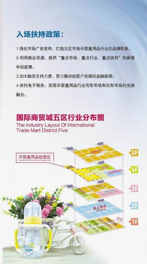 義烏中國小商品城經(jīng)過幾十年的發(fā)展,從最初經(jīng)濟(jì)落后的小城,發(fā)展到如今海內(nèi)外知名的中國小商品出口批發(fā)市場。如今的義烏,有89個(gè)國家的3100多家境外企業(yè)設(shè)立代表處,常駐外商達(dá)1.3萬余名,到義烏參觀采購的日客流量21萬多人次,其中海外買家占70%,國內(nèi)買家30%,年出口57.6萬多個(gè)標(biāo)準(zhǔn)集裝箱。目前整個(gè)義烏小商品城設(shè)有一到五區(qū),營業(yè)面積470余萬平方米,商位7萬多個(gè),區(qū)區(qū)相連,十分便利。由于歷史的原因,孕嬰童產(chǎn)品沒有統(tǒng)一整合、集中經(jīng)營,使得國內(nèi)外采購商采購孕嬰童產(chǎn)品需要跨越多個(gè)區(qū)域市場,不能進(jìn)行一站式采購,耗時(shí)耗力,十分不便。