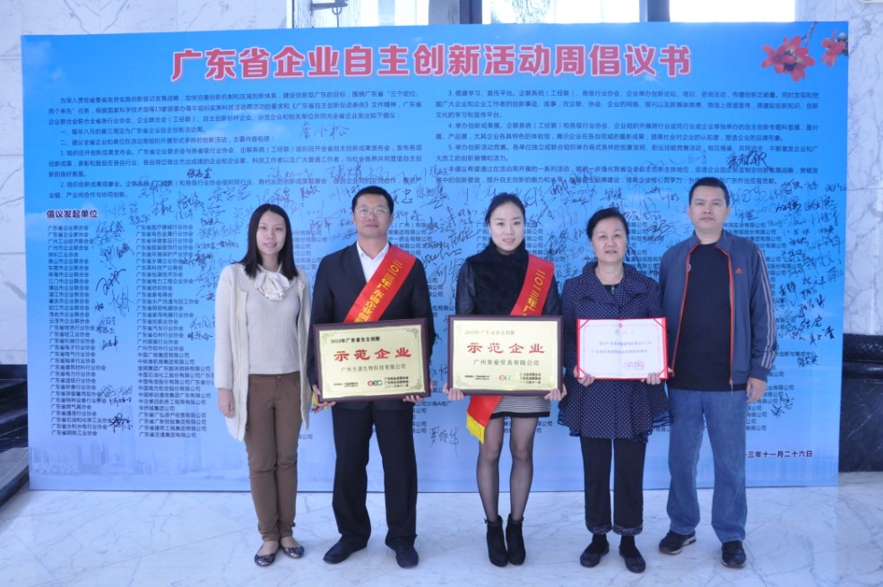 2013年11月26日由廣東省企業(yè)聯(lián)合會、廣東省企業(yè)家協(xié)會主辦2013年廣東省企業(yè)自主創(chuàng)新成果發(fā)布會在廣州召開。各地市經(jīng)信局、行業(yè)協(xié)會和企業(yè)共200多人參加了會議。會議對獲得廣東省自主創(chuàng)新示范企業(yè)、廣東省自主創(chuàng)新標(biāo)桿企業(yè)、廣東省推動自主創(chuàng)新杰出企業(yè)家、廣東省企業(yè)創(chuàng)新紀(jì)錄金獎企業(yè)、廣東省企業(yè)創(chuàng)新紀(jì)錄優(yōu)秀組織單位,及第八批2013年廣東省企業(yè)創(chuàng)新紀(jì)錄項目的企業(yè)和單位進(jìn)行了表彰。