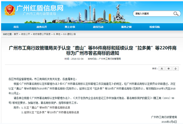廣州市工商行政管理局關(guān)于“廣州市著名商標(biāo)”的公告